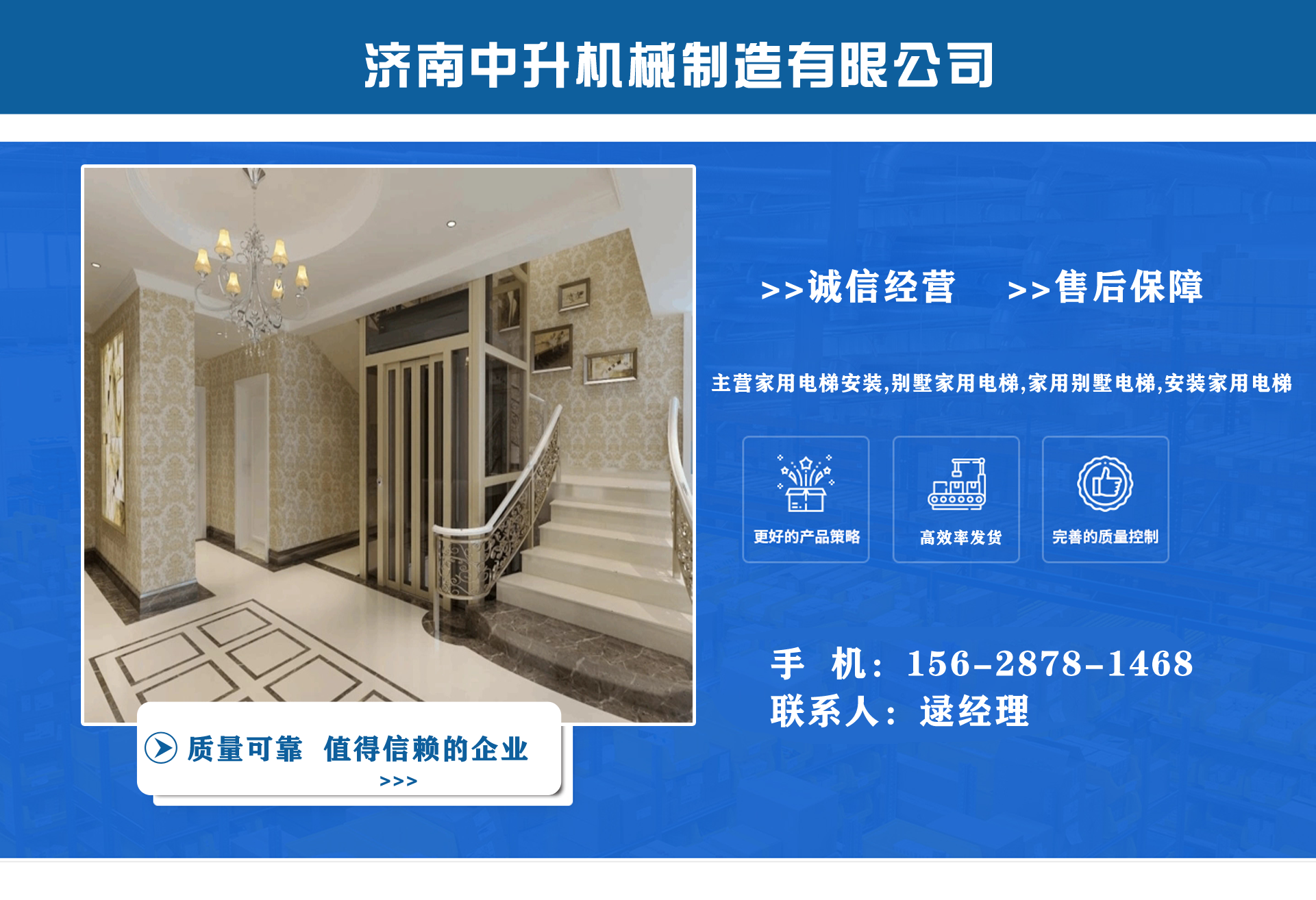 濟南中升機械制造有限公司主營家用電梯安裝,別墅家用電梯,家用別墅電梯,安裝家用電梯等業務,質量可靠,值得信賴!  公司為客戶提供免費上門測量,根據實際情況1對1服務,保障符合用戶需求,終身提供售后服務,讓用戶買的舒心用的放心。匠心團隊,打造信賴產品,我們有團結、奮進拼搏的匠心團隊,為您提供可信賴的品質保證。  從創立以來一直嚴格執行質量管理體系、環境管理體系等相關標準管理體系,“顧客滿意”是我們始終如一的追求。我們有屬于自己培養的安裝隊伍,24小時服務電話,為您提供可靠的服務與支持。  我們的愿景是建設國內具有影響力的電梯公司,做城市美好空間的好伙伴。...